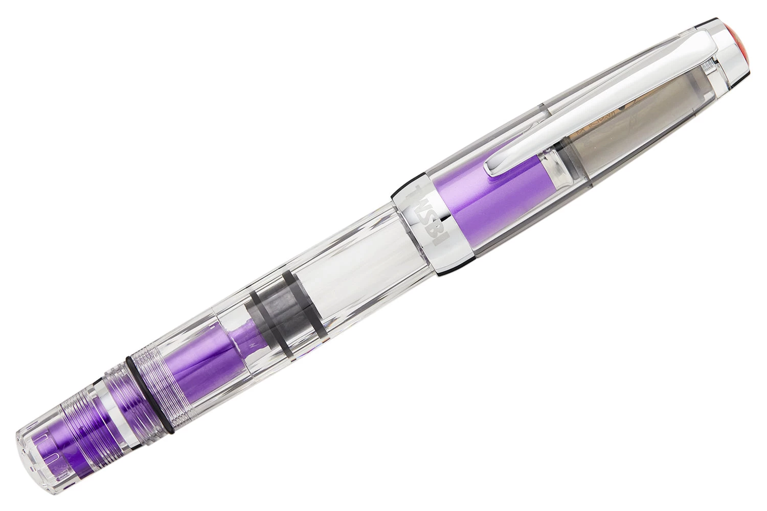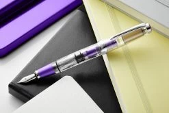 The TWSBI Mini AL comes with a benchmark piston ink-filling mechanism and has all detachable parts. Like many other TWSBI fountain pens, it features a crystal clear acrylic barrel so you can see your ink level, and a clear cap. It is enhanced with a purple aluminum grip section and piston mechanism. It is completed with silver trim and a silver stainless steel nib.