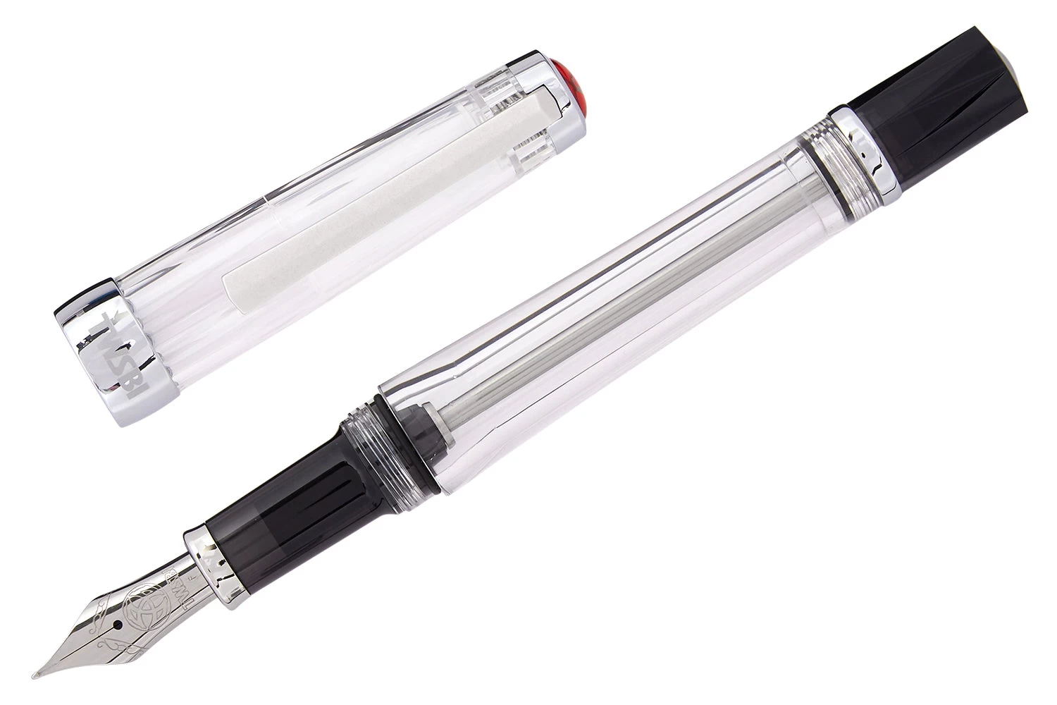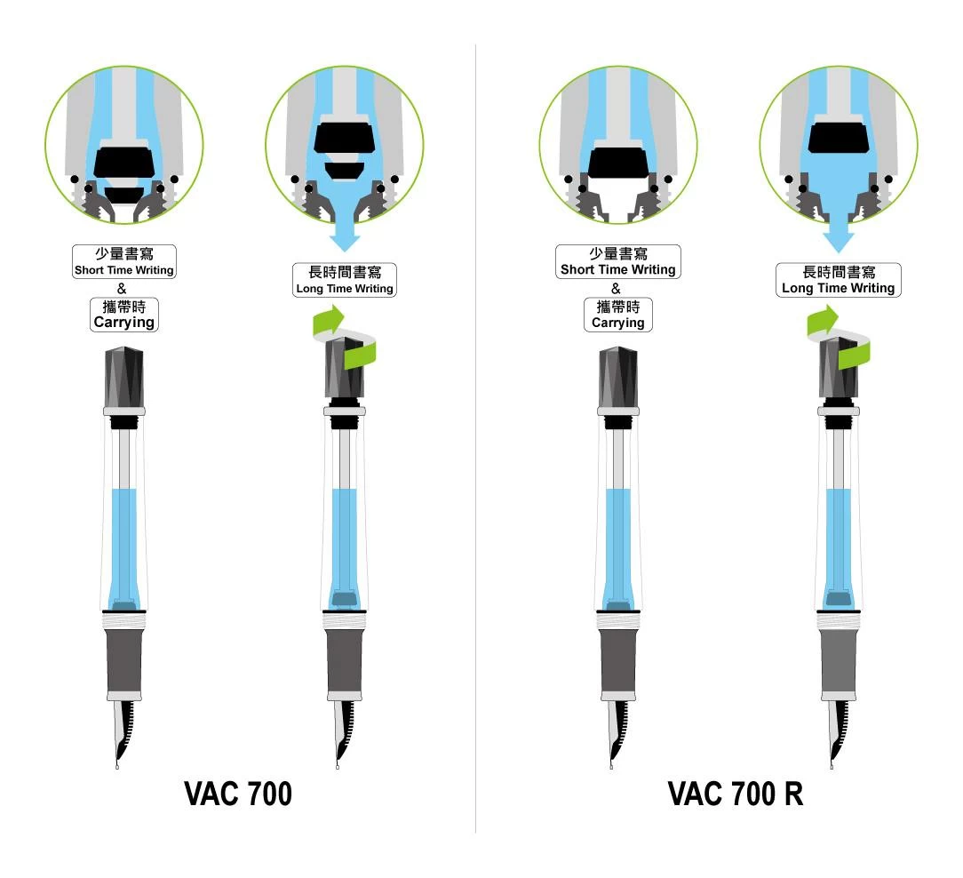The TWSBI Vac700R comes with a vacuum filler mechanism. This fountain pen features a clear demonstrator body with a stainless steel nib.