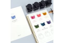 This A5 notebook is great for cataloging your favorite fountain pen colors! The paper is Wearingeul’s Impressions paper with a weight of 200g/m². Each sheet has nine bottle images with two lines underneath so you can write the ink name below the bottle image.